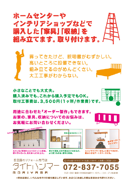 また、畳表替えや畳新調、ふすま張り替え、クロス(壁紙)の張り替えはもちろん、棚板を壁に作りたい、手すりをつけたい、ハンガーパイプの設置、床フローリングのキズ補修など、DIYでは難しいけれど「こんなことをお願いしてもいい?」と思われることも当社ではお受けしています。ちょっとしたアイデアでもうんと暮らしやすくなります。お気軽にご相談下さいませ。